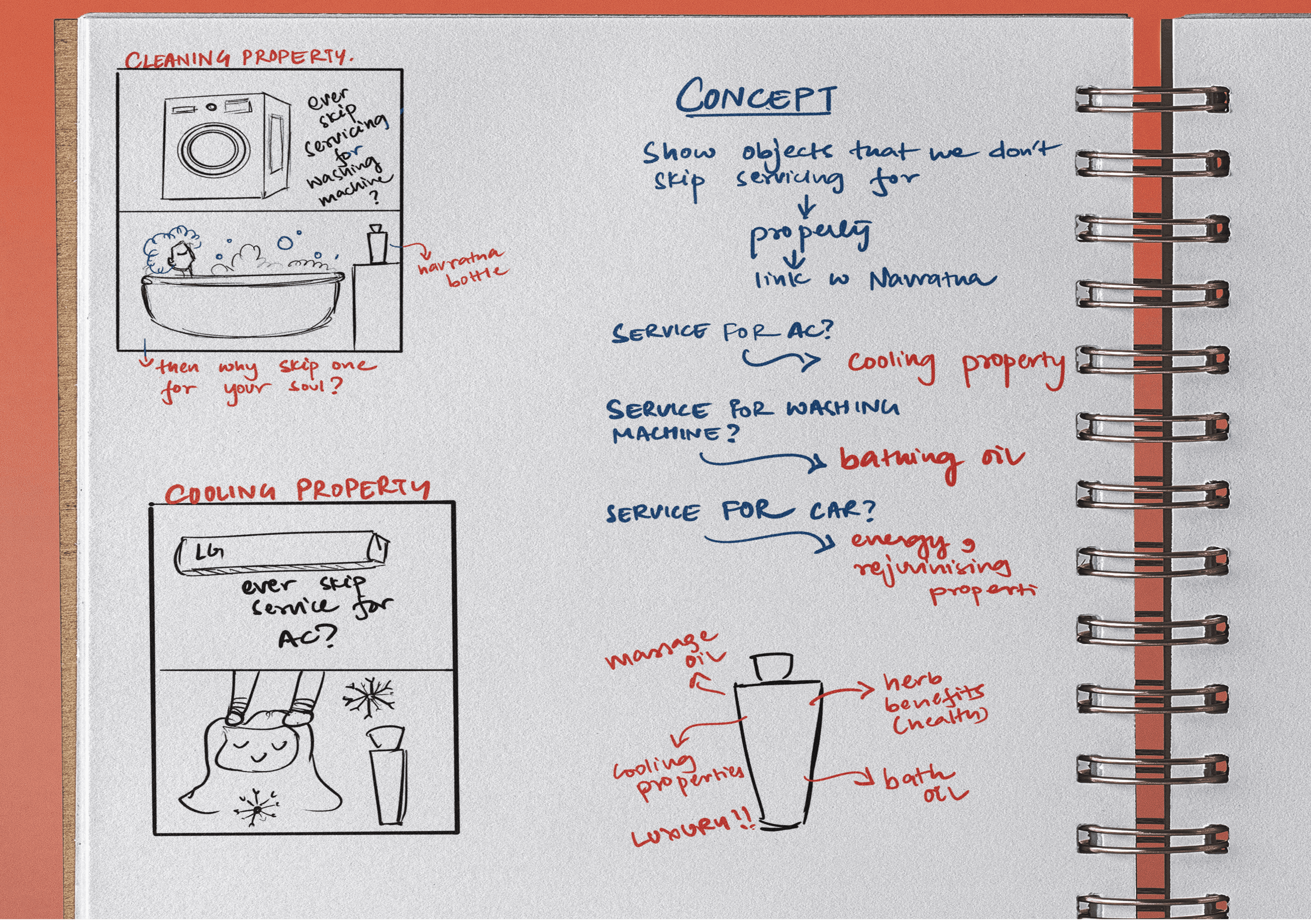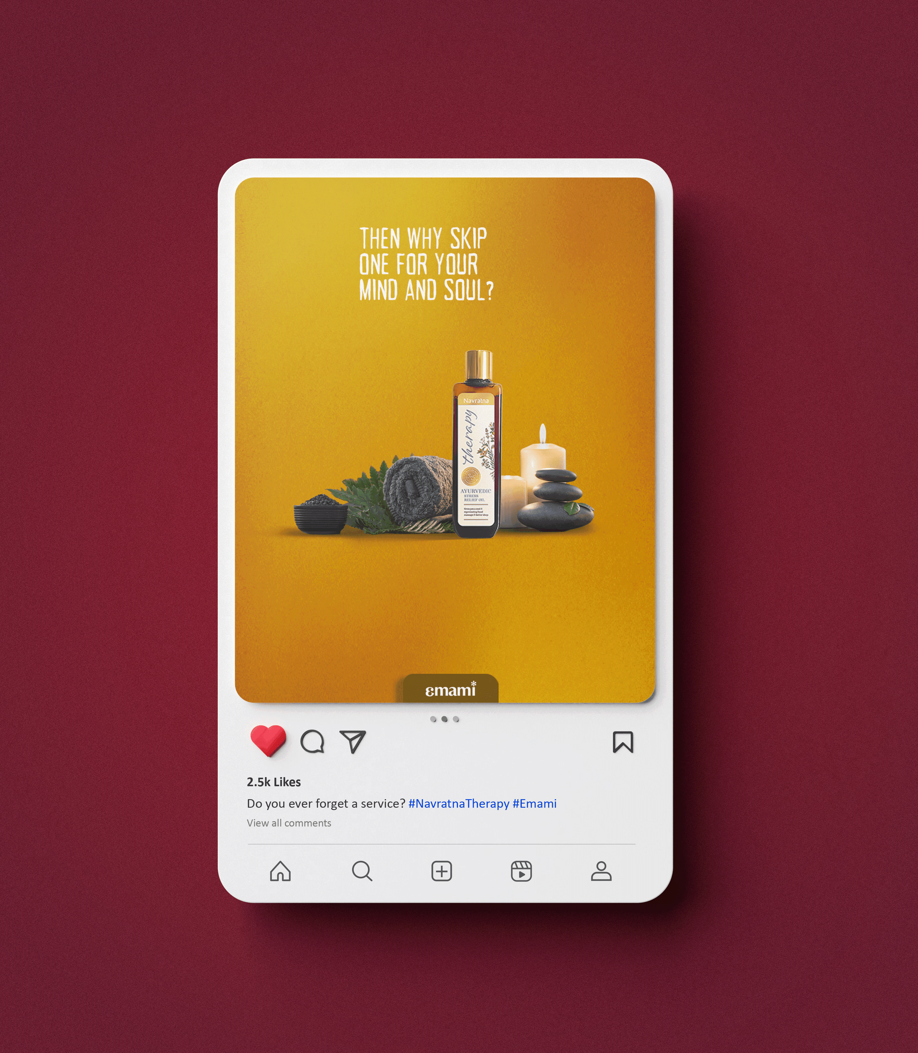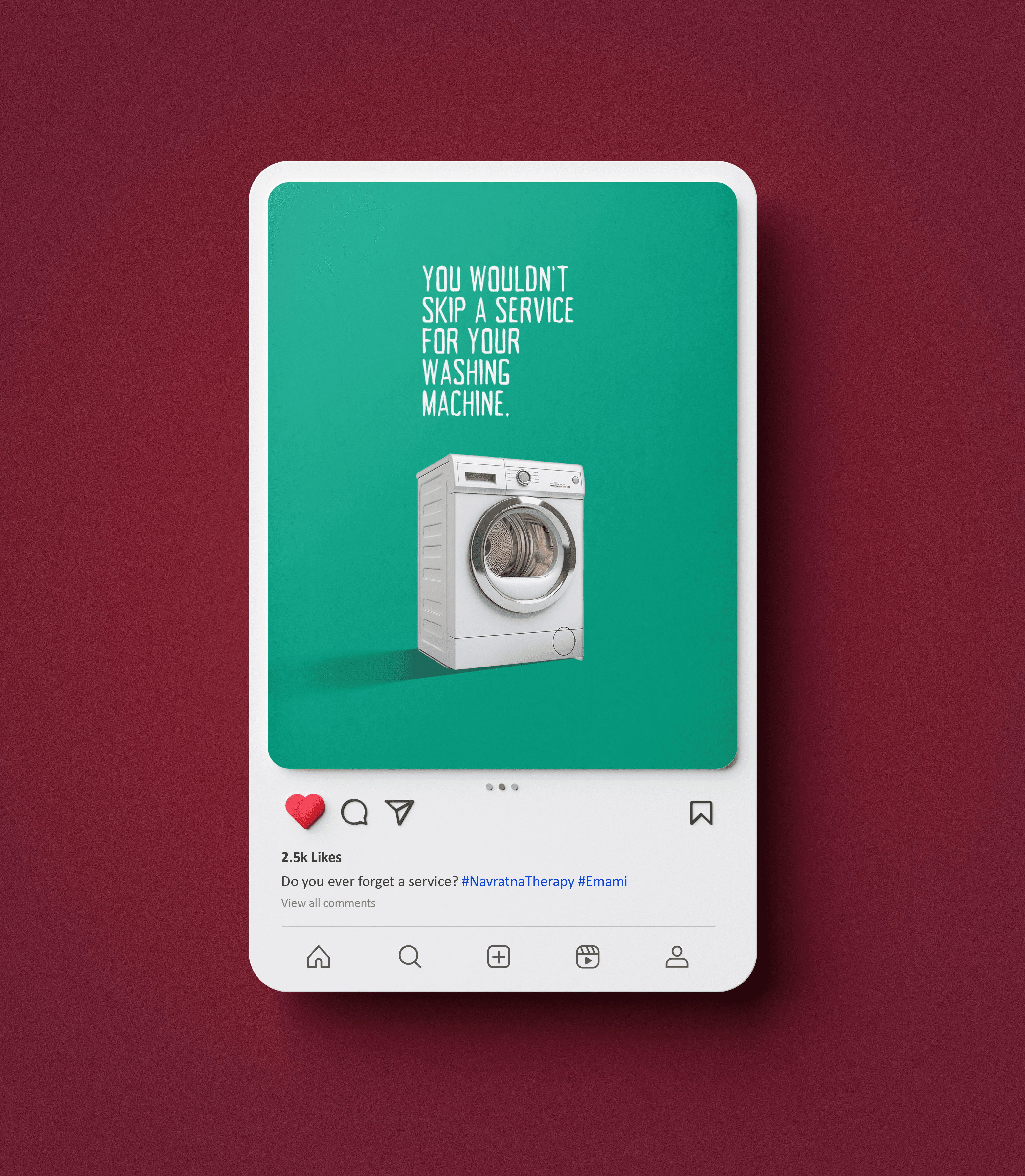 The concept focused on highlighting Navratna Therapy's benefits by drawing parallels with routine maintenance tasks. For instance, "If you don’t skip servicing for your washing machine, why skip yourself?" showcasing its cleansing benefits as a bathing oil. This approach creatively linked essential self-care to everyday responsibilities.